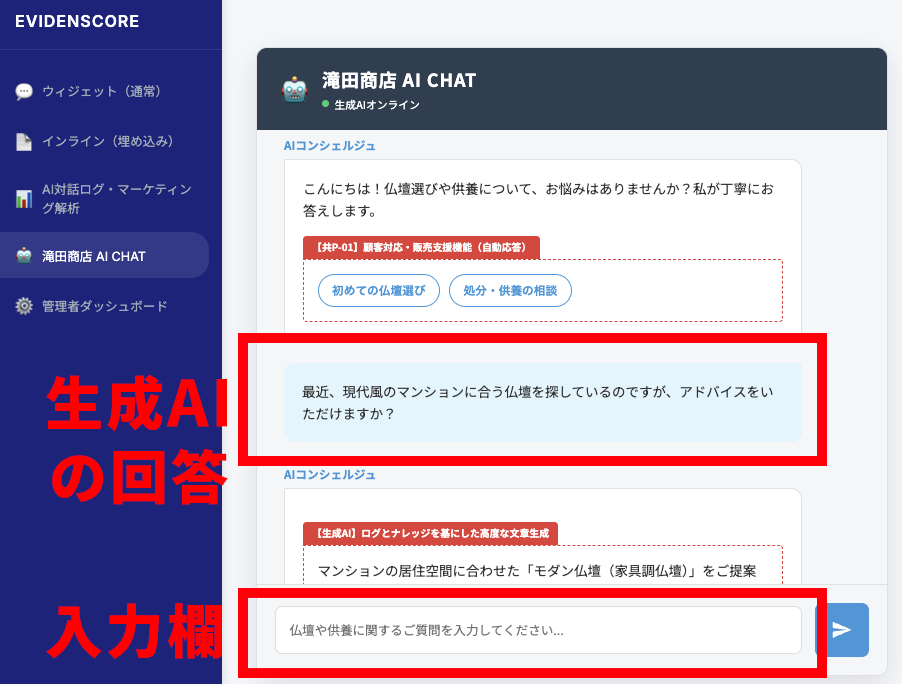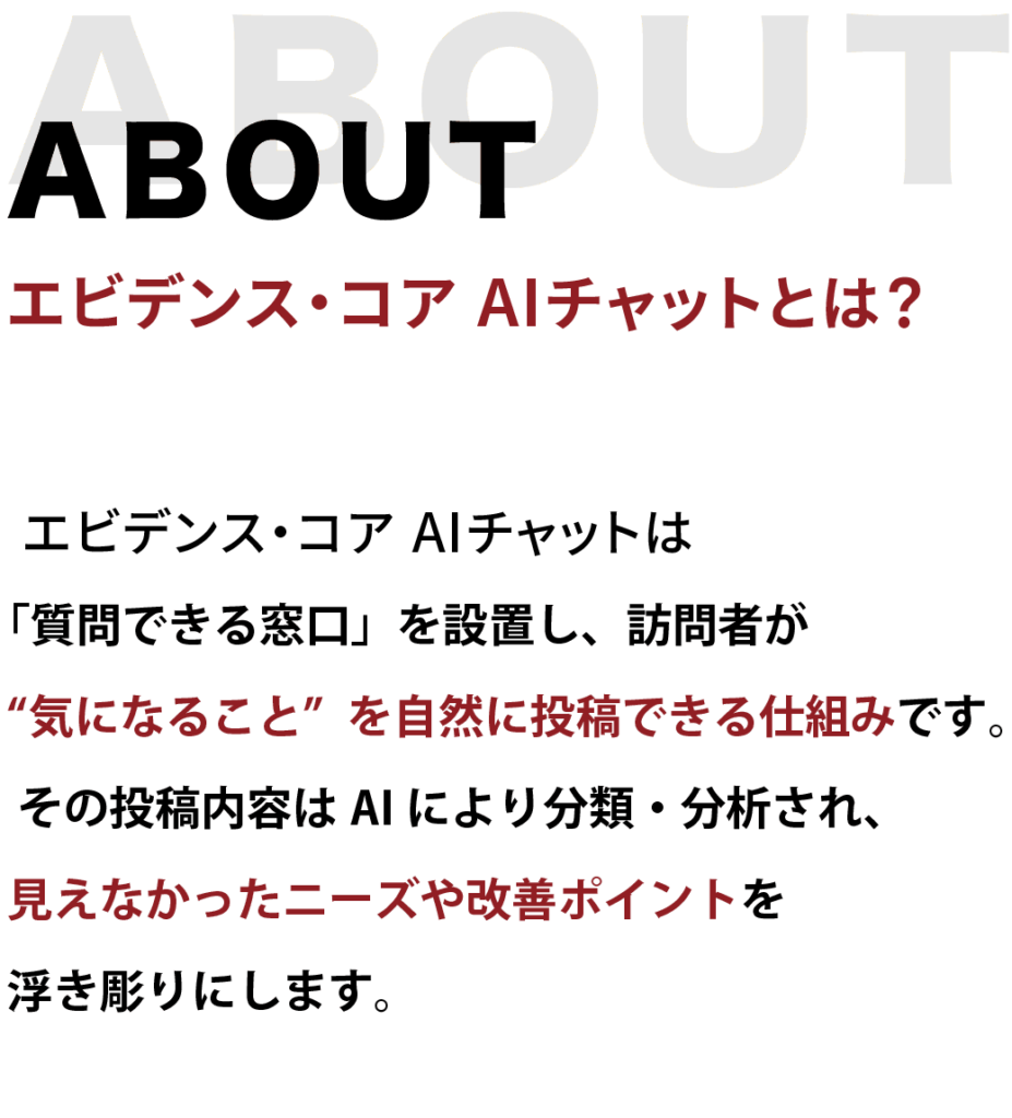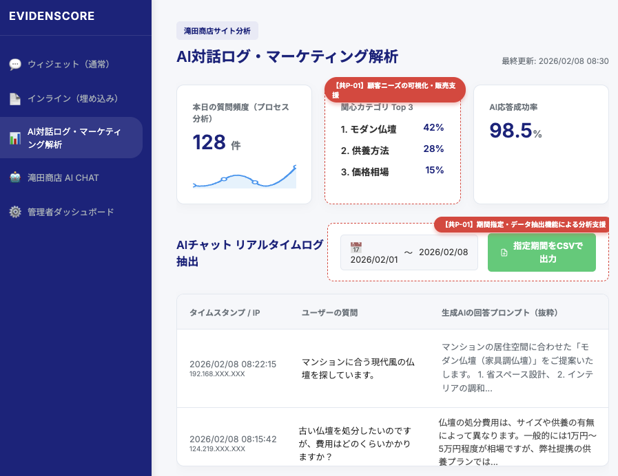 弊社が提供する「エビデンス・コア AIチャット」は、AIが即時に自動応答を行うことで、営業時間外も含めた24時間対応を実現。すべての質問をデータベースに自動記録し、管理画面やCSV形式で管理者が容易に確認・分析が可能です。この質問履歴を分析することで、訪問者の関心・検討状況・課題を可視化し、商品・サービスの改善や提案内容の最適化につなげることができます。