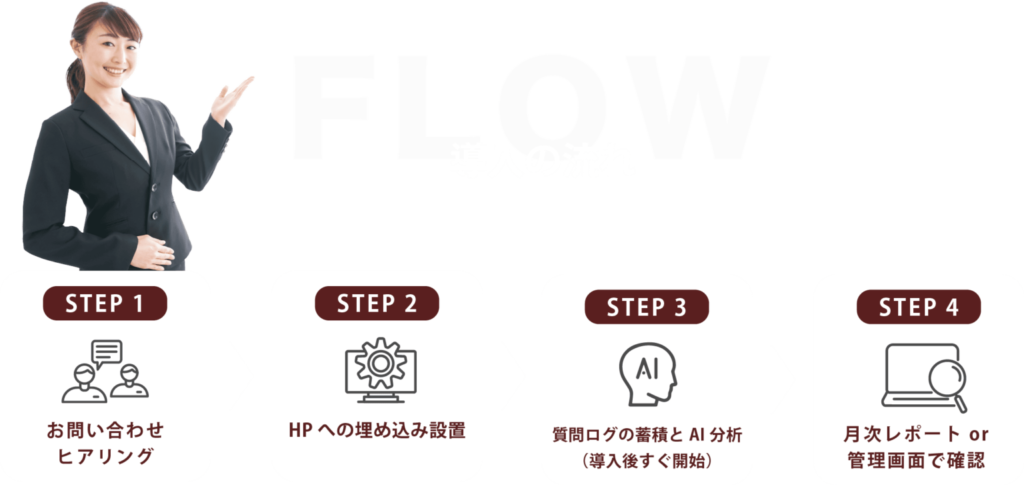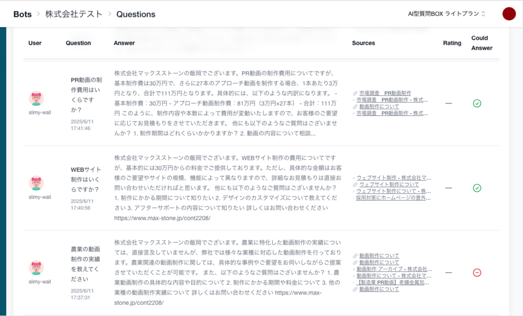 弊社が提供する「AI型質問BOX」は、AIが即時に自動応答を行うことで、営業時間外も含めた24時間対応を実現。すべての質問とAIの回答内容をデータベースに自動記録し、管理画面やCSV形式で管理者が容易に確認・分析が可能です。この質問履歴を分析することで、訪問者の関心・検討状況・課題を可視化し、商品・サービスの改善や提案内容の最適化につなげることができます。